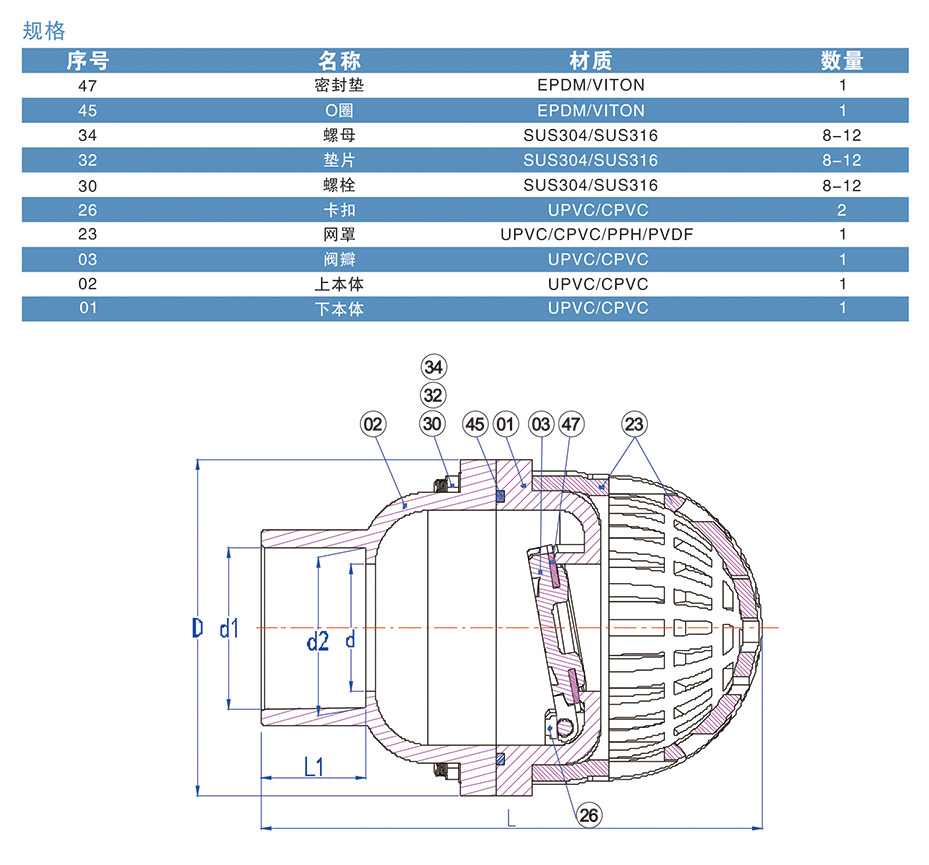 1) 材質:UPVC,CPVC,PPH,PVDF